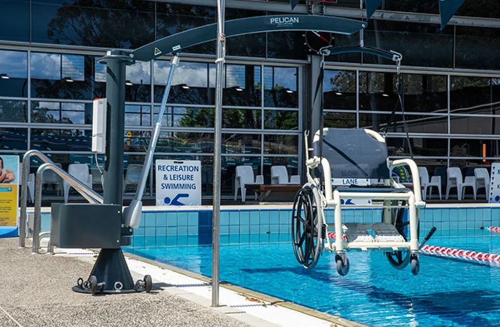 The Pelican Pool Hoist enables patrons with limited mobility to enter and exit the pool safely and comfortably restoring independence and enhancing the overall aquatic experience.